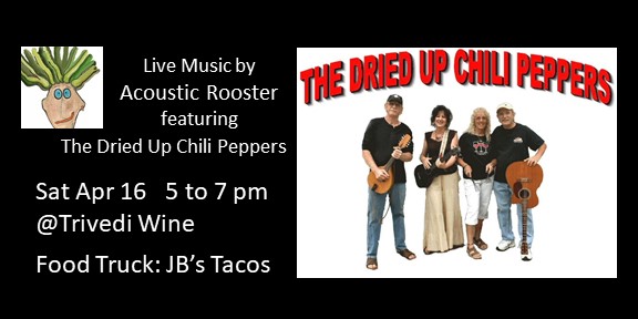 The popular local band Acoustic Rooster will be joining their friends The Dried Up Chili Peppers to provide us some entertaining music from 5 to 7 pm on April 16.